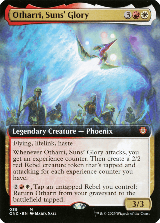 Flying, lifelink, haste Whenever Otharri attacks, you get an experience counter. Then create a 2/2 red Rebel creature token that's tapped and attacking for each experience counter you have. {2}{R}{W}, Tap an untapped Rebel you control: Return this card from your graveyard to the battlefield tapped.