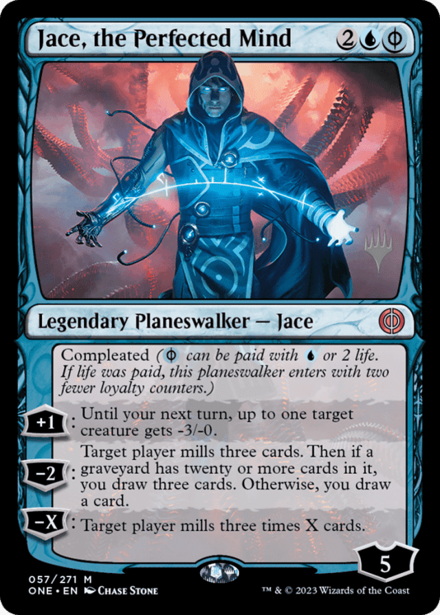 A Phyrexian mana symbol contributes 1 toward the mana value of a card, even if life is paid for it. Specifically, Jace's mana value is always 4. — Jace's second loyalty ability doesn't care which player's graveyard has twenty or more cards in it. It could be the target player's or another player's. — Other replacement effects that would change the number of loyalty counters Jace enters with will apply as normal. — The compleated ability looks only at whether a player chose to pay 2 life for a Phyrexian mana symbol as they were casting the spell. If a player paid life for some other reason while casting the spell, that will not reduce the number of loyalty counters the planeswalker enters the battlefield with.