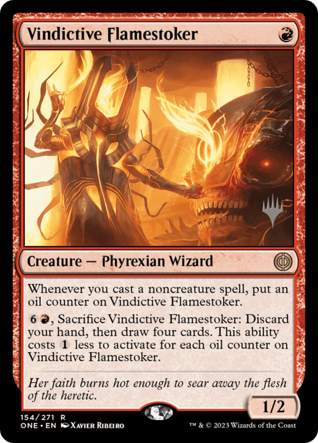 Whenever you cast a noncreature spell, put an oil counter on this creature. {6}{R}, Sacrifice this creature: Discard your hand, then draw four cards. This ability costs {1} less to activate for each oil counter on this creature.