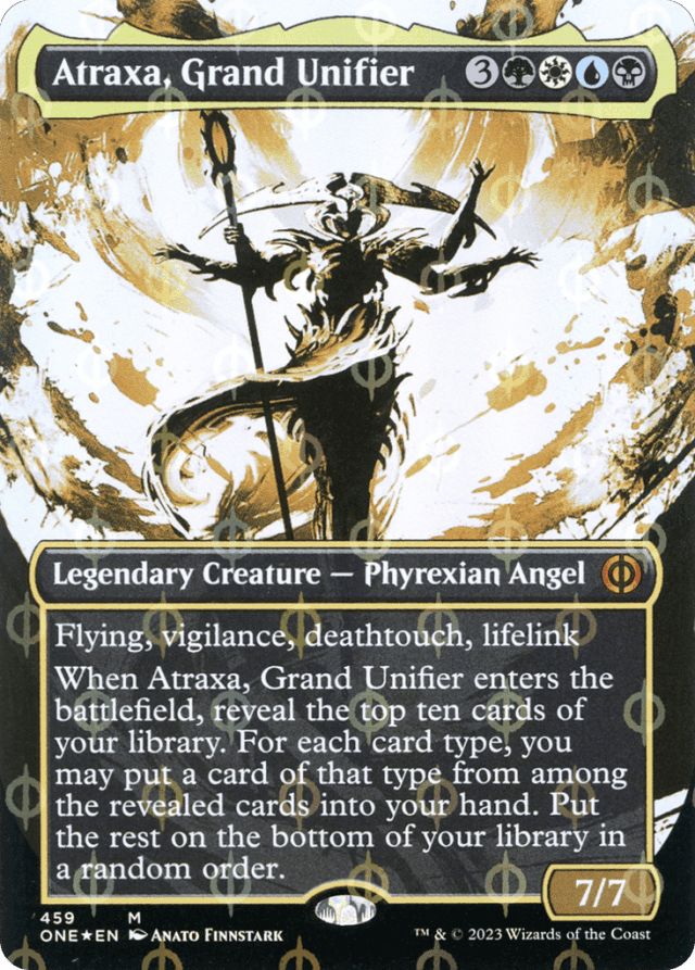 Flying, vigilance, deathtouch, lifelink When Atraxa enters, reveal the top ten cards of your library. For each card type, you may put a card of that type from among the revealed cards into your hand. Put the rest on the bottom of your library in a random order. (Artifact, battle, creature, enchantment, instant, land, planeswalker, and sorcery are card types.)