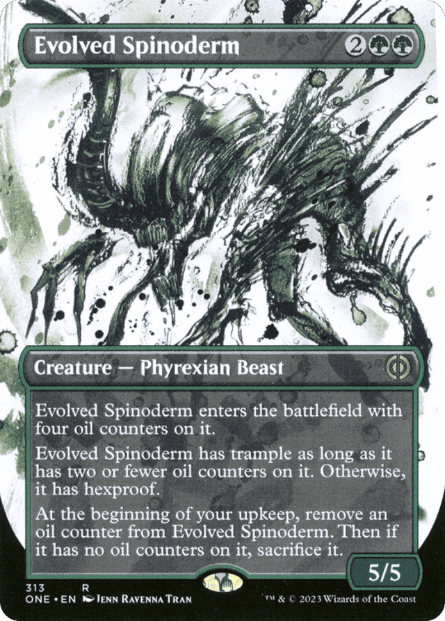 This creature enters with four oil counters on it. This creature has trample as long as it has two or fewer oil counters on it. Otherwise, it has hexproof. At the beginning of your upkeep, remove an oil counter from this creature. Then if it has no oil counters on it, sacrifice it.