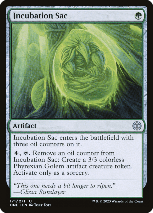 This artifact enters with three oil counters on it. {4}, {T}, Remove an oil counter from this artifact: Create a 3/3 colorless Phyrexian Golem artifact creature token. Activate only as a sorcery.