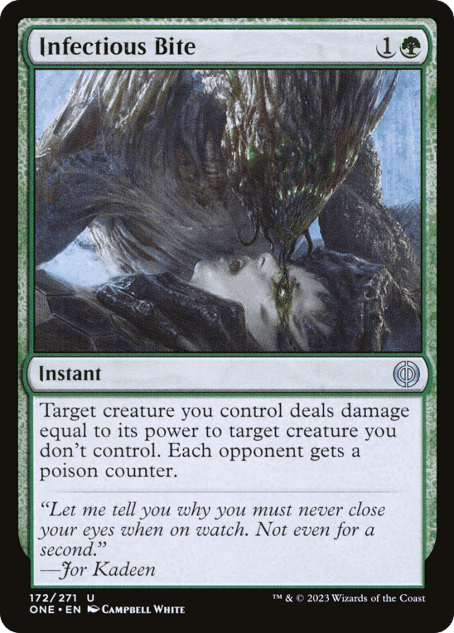 Target creature you control deals damage equal to its power to target creature you don't control. Each opponent gets a poison counter.