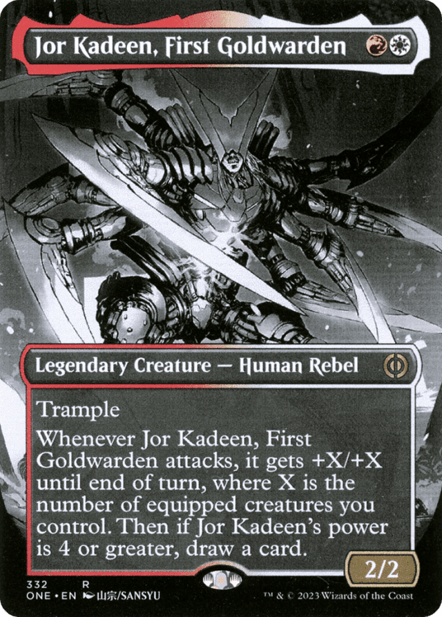 Trample Whenever Jor Kadeen attacks, it gets +X/+X until end of turn, where X is the number of equipped creatures you control. Then if Jor Kadeen's power is 4 or greater, draw a card.