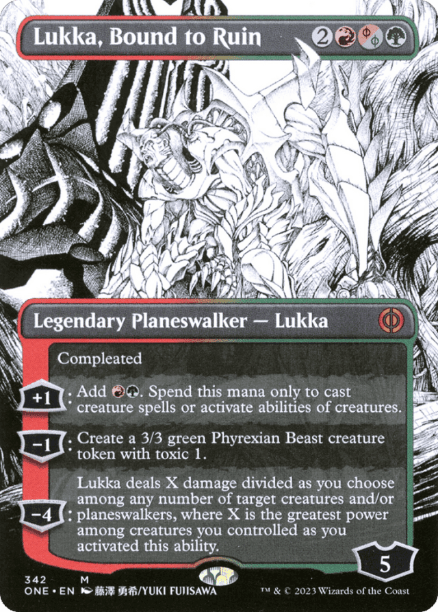Compleated ({R/G/P} can be paid with {R}, {G}, or 2 life. If life was paid, this planeswalker enters with two fewer loyalty counters.) [+1]: Add {R}{G}. Spend this mana only to cast creature spells or activate abilities of creatures. [−1]: Create a 3/3 green Phyrexian Beast creature token with toxic 1. [−4]: Lukka deals X damage divided as you choose among any number of target creatures and/or planeswalkers, where X is the greatest power among creatures you control as you activate this ability.