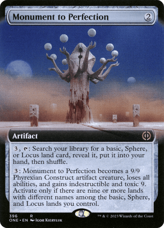 {3}, {T}: Search your library for a basic, Sphere, or Locus land card, reveal it, put it into your hand, then shuffle. {3}: This artifact becomes a 9/9 Phyrexian Construct artifact creature, loses all abilities, and gains indestructible and toxic 9. Activate only if there are nine or more lands with different names among the basic, Sphere, and Locus lands you control.