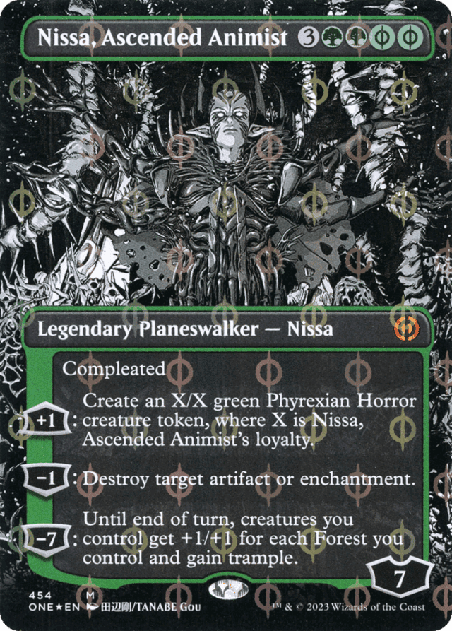 Compleated ({G/P} can be paid with {G} or 2 life. For each {G/P} paid with life, this planeswalker enters with two fewer loyalty counters.) [+1]: Create an X/X green Phyrexian Horror creature token, where X is Nissa's loyalty. [−1]: Destroy target artifact or enchantment. [−7]: Until end of turn, creatures you control get +1/+1 for each Forest you control and gain trample.