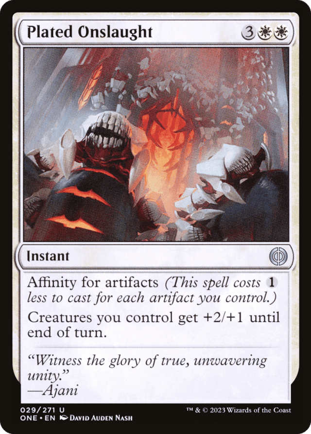 Affinity for artifacts (This spell costs {1} less to cast for each artifact you control.) Creatures you control get +2/+1 until end of turn.