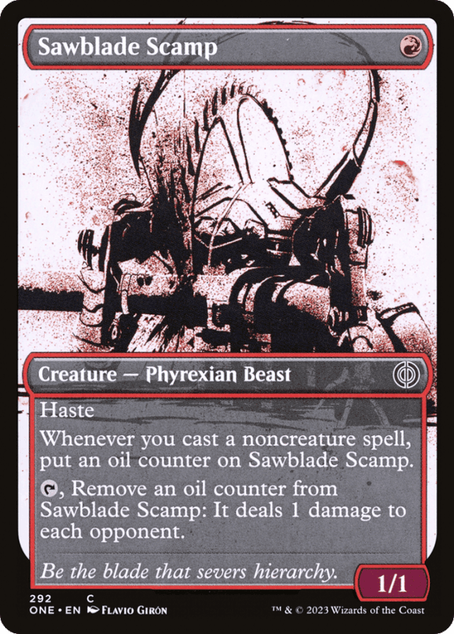 Haste Whenever you cast a noncreature spell, put an oil counter on this creature. {T}, Remove an oil counter from this creature: It deals 1 damage to each opponent.