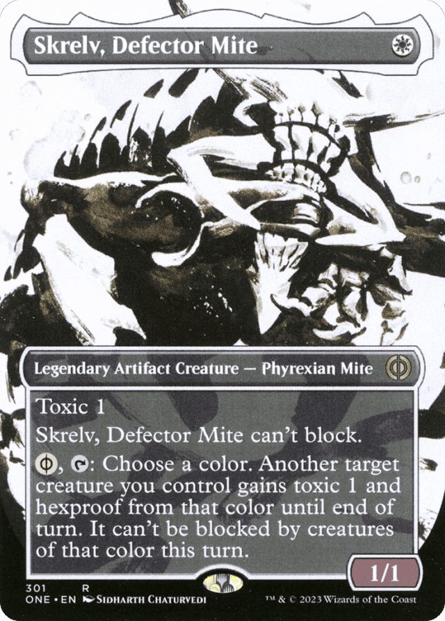 Toxic 1 (Players dealt combat damage by this creature also get a poison counter.) Skrelv can't block. {W/P}, {T}: Choose a color. Another target creature you control gains toxic 1 and hexproof from that color until end of turn. It can't be blocked by creatures of that color this turn. ({W/P} can be paid with either {W} or 2 life.)