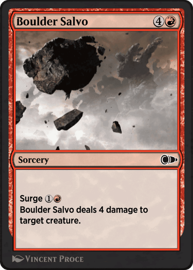Surge {1}{R} (You may cast this spell for its surge cost if you or a teammate has cast another spell this turn.) Boulder Salvo deals 4 damage to target creature.