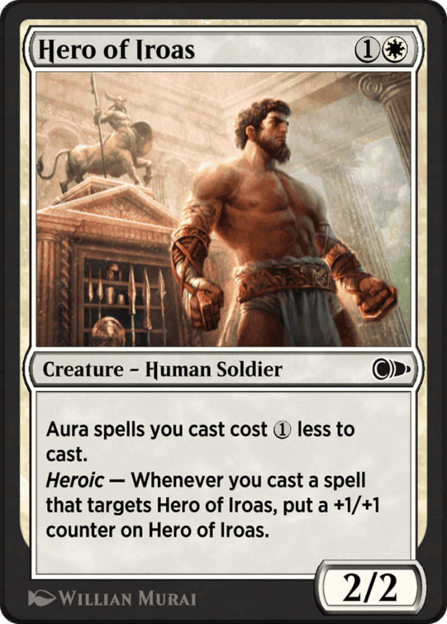 Heroic abilities will resolve before the spell that caused them to trigger. — Heroic abilities will trigger only once per spell, even if that spell targets the creature with the heroic ability multiple times. — Heroic abilities won't trigger when a copy of a spell is created on the stack or when a spell's targets are changed to include a creature with a heroic ability. — Hero of Iroas's first ability will apply if you cast a card for its bestow cost. — Hero of Iroas's first ability reduces only generic mana in the spell's total cost. — To determine the total cost of a spell, start with the mana cost or alternative cost you're paying, add any cost increases, then apply any cost reductions. The mana value of the spell remains unchanged, no matter what the total cost to cast it was.
