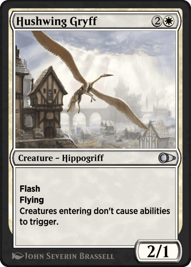 Abilities that apply “as [this creature] enters the battlefield,” such as choosing a creature to copy with Mercurial Pretender, are also unaffected. — Abilities that create replacement effects, such as a permanent entering the battlefield tapped or with counters on it, are unaffected. — Hushwing Gryff’s ability stops a creature’s own enters-the-battlefield triggered abilities as well as other triggered abilities that would trigger when a creature enters the battlefield. — If Hushwing Gryff and another creature enter the battlefield at the same time, neither creature entering the battlefield will cause triggered abilities to trigger. — Look at the permanent as it exists on the battlefield, taking into account continuous effects, to determine whether any triggered abilities will trigger. For example, if you control March of the Machines, which says, in part, “Each noncreature artifact is an artifact creature,” each artifact will be a creature at the time it enters the battlefield and will not cause triggered abilities to trigger. — The trigger event doesn’t have to specify “creatures” entering the battlefield. For example, Amulet of Vigor says “Whenever a permanent enters the battlefield tapped and under your control, untap it.” If a creature enters the battlefield tapped and under your control, Amulet of Vigor’s ability would not trigger. If a land (that isn’t also a creature) enters the battlefield tapped and under your control, Amulet of Vigor’s ability would trigger. — Triggered abilities use the word “when,” “whenever,” or “at.” They’re often written as “[Trigger condition], [effect].”