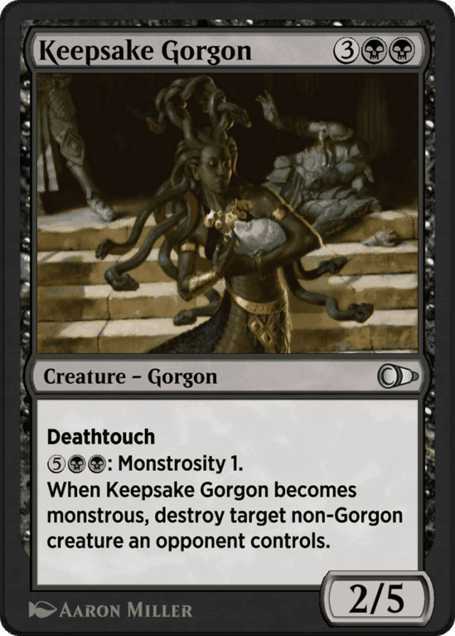 Deathtouch {5}{B}{B}: Monstrosity 1. (If this creature isn't monstrous, put a +1/+1 counter on it and it becomes monstrous.) When this creature becomes monstrous, destroy target non-Gorgon creature an opponent controls.