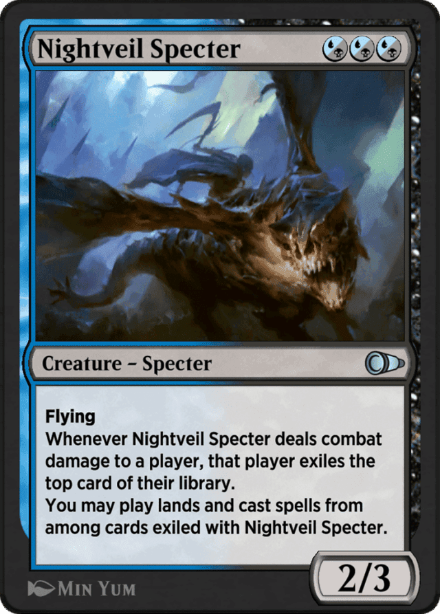 Nightveil Specter’s last ability applies to cards exiled with that specific Nightveil Specter, not any other creature named Nightveil Specter. You should keep cards exiled by different Nightveil Specters separate. — Playing a card exiled with Nightveil Specter follows all the normal rules for playing that card. You must pay its costs, and you must follow all timing restrictions, for example. — The card is exiled face up. All players may look at it.