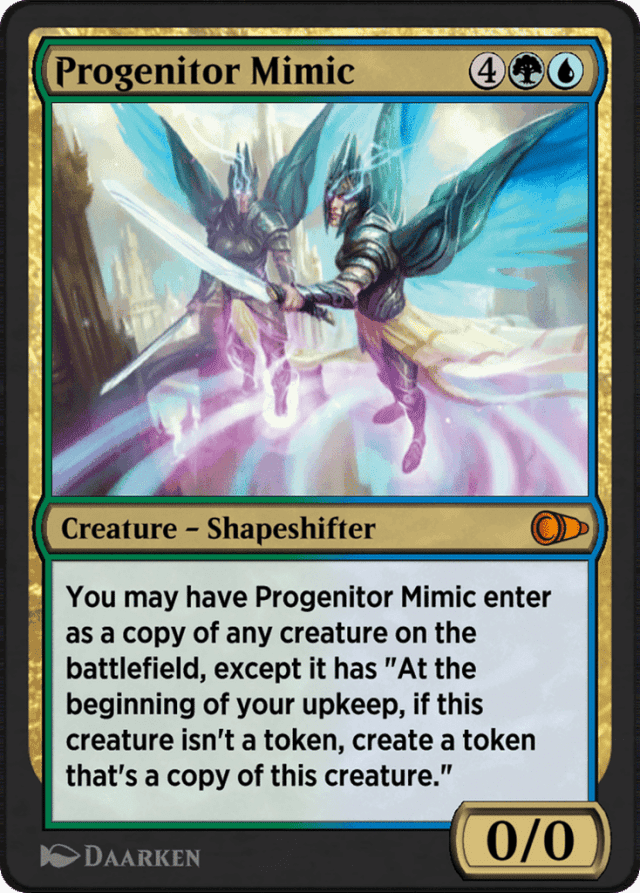 Any enters-the-battlefield abilities of the copied creature will trigger when Progenitor Mimic enters the battlefield. Any “as [this creature] enters the battlefield” or “[this creature] enters the battlefield with” abilities of the chosen creature will also work. — If Progenitor Mimic somehow enters the battlefield at the same time as another creature, it can't become a copy of that creature. You may choose only a creature that's already on the battlefield. — If the chosen creature has {X} in its mana cost (such as Protean Hydra), X is considered to be zero. — If the chosen creature is a token, Progenitor Mimic copies the original characteristics of that token as stated by the effect that put it onto the battlefield. Copying a token doesn't make Progenitor Mimic become a token. — If you choose to have Progenitor Mimic enter the battlefield as a copy of a creature, the triggered ability it gains will become part of its copiable values. For example, suppose Progenitor Mimic enters the battlefield as a copy of Runeclaw Bear, a 2/2 green Bear creature with mana cost {1}{G}. The resulting object is a 2/2 green Bear creature named Runeclaw Bear with mana cost {1}{G} and with “At the beginning of your upkeep, if this creature isn't a token, put a token onto the battlefield that's a copy of this creature.” If another Progenitor Mimic enters the battlefield as a copy of that creature, it will be a Runeclaw Bear with two instances of the triggered ability. — Progenitor Mimic copies exactly what was printed on the original creature and nothing more (unless that creature is copying something else or is a token). It doesn't copy whether that creature is tapped or untapped, whether it has any counters on it or Auras attached to it, or any non-copy effects that have changed its power, toughness, types, color, or so on. — The original Progenitor Mimic will create tokens, but those token copies will not. — You can choose not to copy anything. In that case, Progenitor Mimic enters the battlefield as a 0/0 Shapeshifter creature and is probably put into the graveyard immediately.