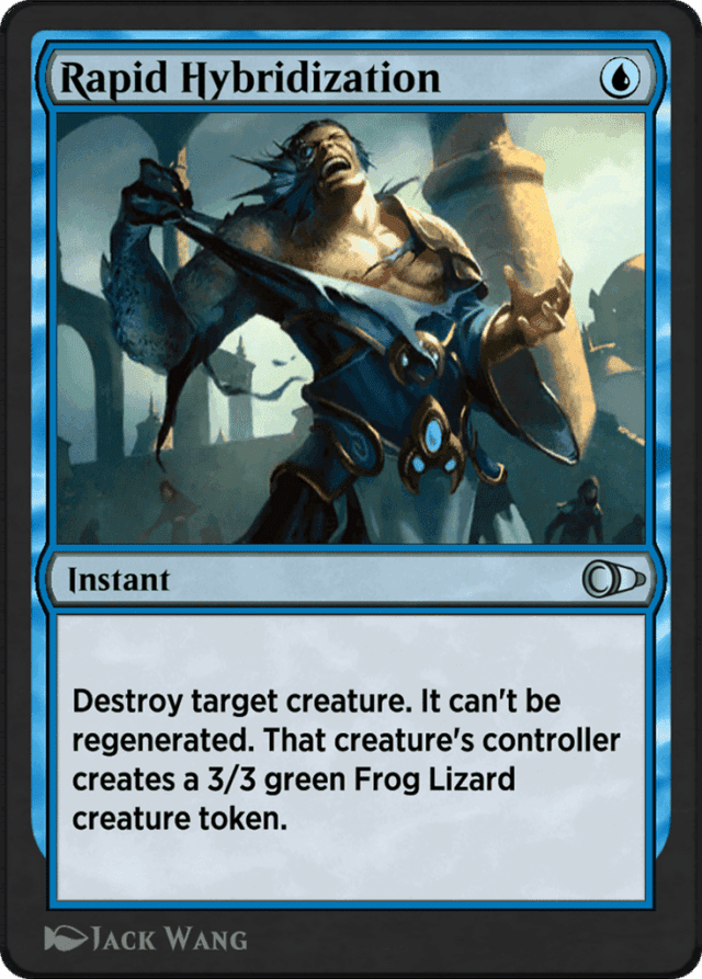 If the creature is an illegal target when Rapid Hybridization tries to resolve, it won't resolve and none of its effects will happen. No Frog Lizard token will be created. — If Rapid Hybridization resolves and the creature isn't destroyed (perhaps because it has indestructible), its controller will still get the Frog Lizard token.