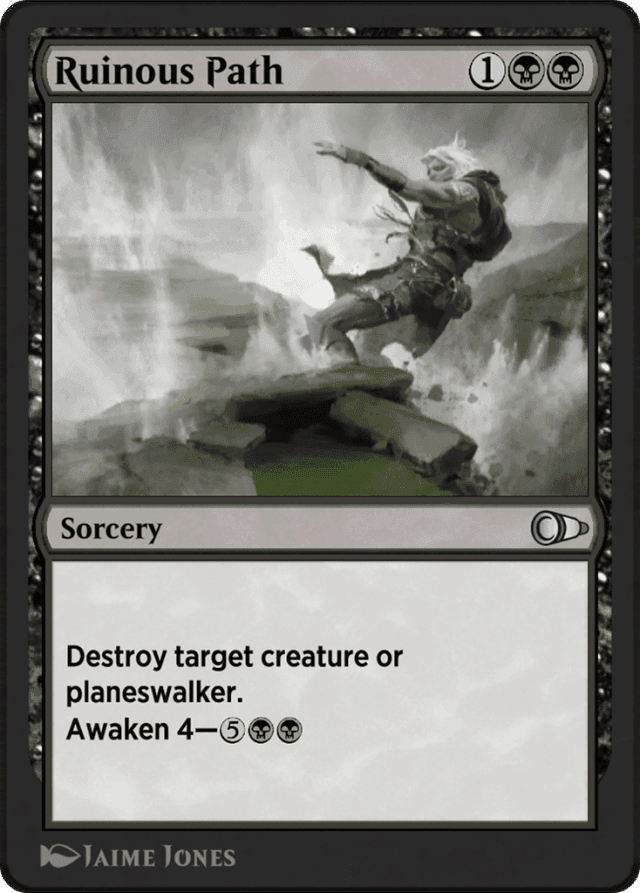 Destroy target creature or planeswalker. Awaken 4—{5}{B}{B} (If you cast this spell for {5}{B}{B}, also put four +1/+1 counters on target land you control and it becomes a 0/0 Elemental creature with haste. It's still a land.)