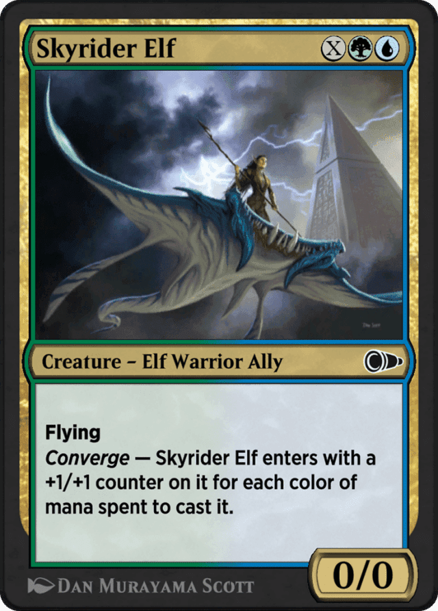 If a spell with a converge ability is copied, no mana was spent to cast the copy, so the number of colors of mana spent to cast the spell will be zero. The number of colors spent to cast the original spell is not copied. — If there are any alternative or additional costs to cast a spell with a converge ability, the mana spent to pay those costs will count. For example, if an effect makes sorcery spells cost {1} more to cast, you could pay {W}{U}{B}{R} to cast Radiant Flames and deal 4 damage to each creature. — If you cast a spell with converge without spending any mana to cast it (perhaps because an effect allowed you to cast it without paying its mana cost), then the number of colors spent to cast it will be zero. — The maximum number of colors of mana you can spend to cast a spell is five. Colorless is not a color. Note that the cost of a spell with converge may limit how many colors of mana you can spend. — Unless a spell or ability allows you to, you can't choose to pay more mana for a spell with a converge ability just to spend more colors of mana. Likewise, if a spell or ability reduces the amount of mana it costs you to cast a spell with converge, you can't ignore that cost reduction in order to spend more colors of mana. — You can choose any value for X. The value chosen for X doesn't directly affect the number of +1/+1 counters Skyrider Elf enters the battlefield with, but it does let you pay more mana and thus spend more colors of mana to cast it. For example, you can choose 0 for the value of X and pay {G}{U} to cast Skyrider Elf for two +1/+1 counters. You can also choose 3 for the value of X, making its mana cost {3}{G}{U}, and pay {W}{U}{B}{R}{G} for five +1/+1 counters.