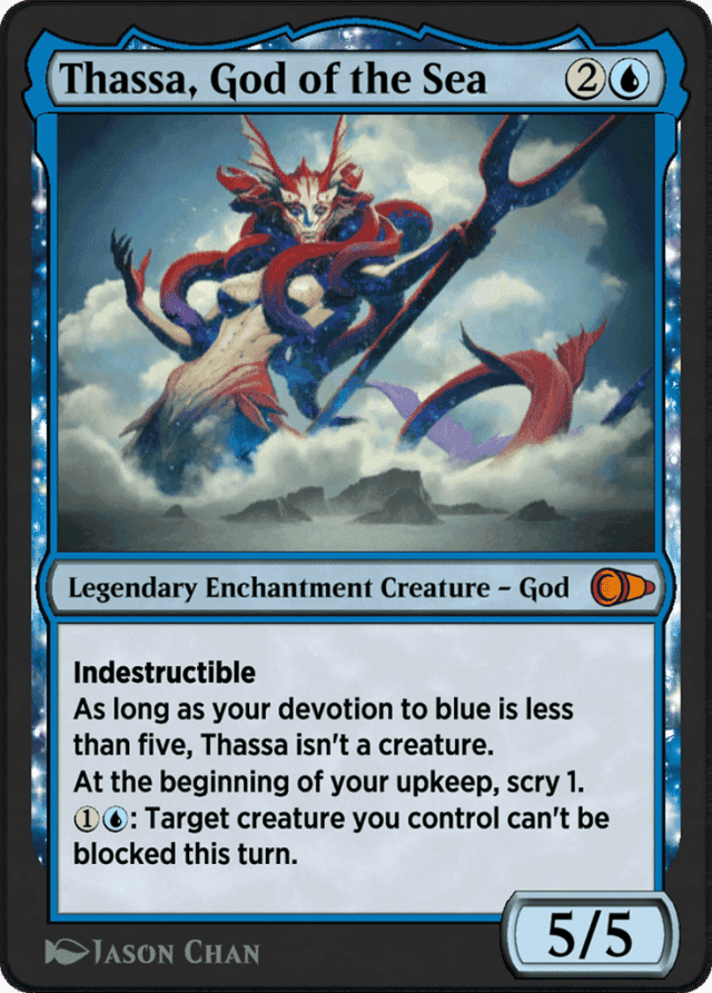 Indestructible As long as your devotion to blue is less than five, Thassa isn't a creature. (Each {U} in the mana costs of permanents you control counts toward your devotion to blue.) At the beginning of your upkeep, scry 1. {1}{U}: Target creature you control can't be blocked this turn.