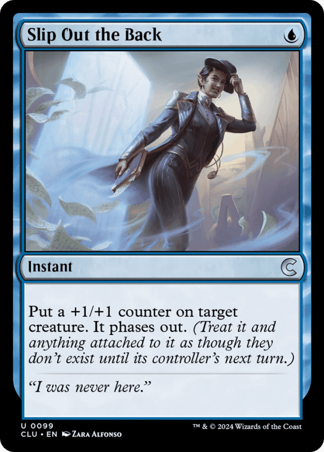 Put a +1/+1 counter on target creature. It phases out. (Treat it and anything attached to it as though they don't exist until its controller's next turn.)