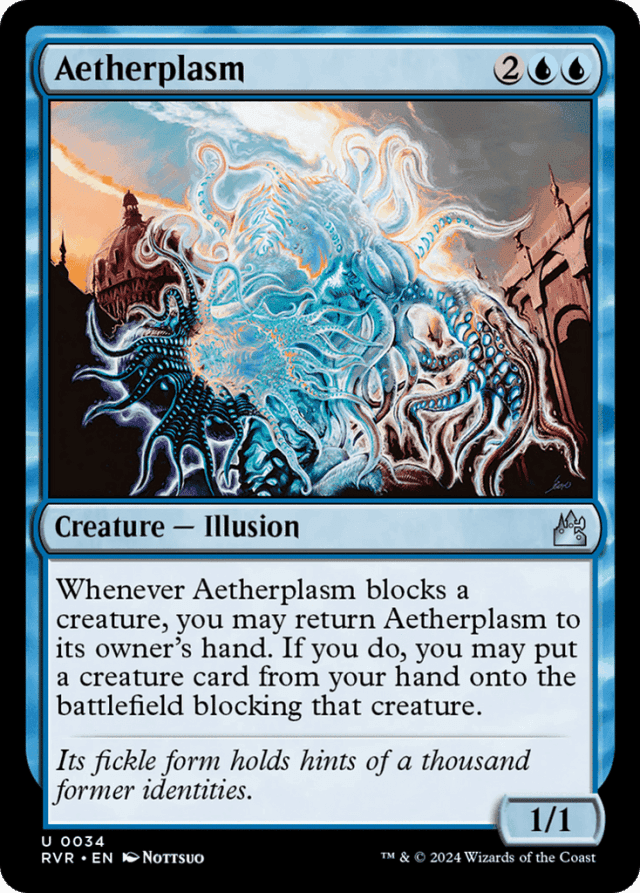 Aetherplasm will return to your hand before any combat damage is assigned. — If you want, you can return Aetherplasm to your hand and not put anything onto the battlefield. The attacking creature will still be considered blocked, so it won't be able to deal combat damage to you unless it has trample or a similar ability. — The creature you put onto the battlefield from your hand is blocking the attacking creature, even if the block couldn't legally be declared (for example, if that creature enters tapped, or it can't block, or the attacking creature has protection from it). — The creature you put onto the battlefield may be the Aetherplasm you just returned to your hand. This allows it to dodge abilities like Deathgazer's. — Although the creature that enters the battlefield is blocking, it was never declared as a blocking creature for the purposes of abilities that trigger whenever a creature blocks (such as Aetherplasm's ability, for example).