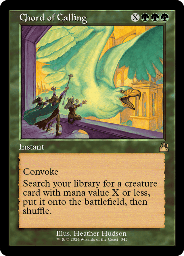 If a card in a player's library has {X} in its mana cost, X is considered to be 0. — Because convoke isn't an alternative cost, it can be used in conjunction with alternative costs. — If a creature you control has a mana ability with {T} in the cost, activating that ability while casting a spell with convoke will result in the creature being tapped before you pay the spell's costs. You won't be able to tap it again for convoke. Similarly, if you sacrifice a creature to activate a mana ability while casting a spell with convoke, that creature won't be on the battlefield when you pay the spell's costs, so you won't be able to tap it for convoke. — Tapping a multicolored creature using convoke will pay for {1} or one mana of your choice of any of that creature's colors. — Tapping an untapped creature that's attacking or blocking to convoke a spell won't cause that creature to stop attacking or blocking. — When calculating a spell's total cost, include any alternative costs, additional costs, or anything else that increases or reduces the cost to cast the spell. Convoke applies after the total cost is calculated. Convoke doesn't change a spell's mana cost or mana value. — When using convoke to cast a spell with {X} in its mana cost, first choose the value for X. That choice, plus any cost increases or decreases, will determine the spell's total cost. Then you can tap creatures you control to help pay that cost. For example, if you cast Chord of Calling (a spell with convoke and mana cost {X}{G}{G}{G}) and choose X to be 3, the total cost is {3}{G}{G}{G}. If you tap two green creatures and two red creatures, you'll have to pay {1}{G}. — You can tap any untapped creature you control to convoke a spell, even one you haven't controlled continuously since the beginning of your most recent turn.