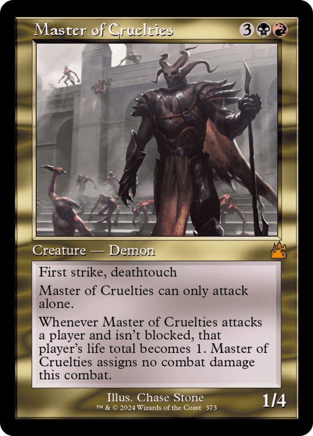 An ability that triggers when something "attacks and isn't blocked" triggers in the declare blockers step after blockers are declared if (1) that creature is attacking and (2) no creatures are declared to block it. It will trigger even if that creature was put onto the battlefield attacking rather than having been declared as an attacker in the declare attackers step. — Assigning no combat damage isn't the same as preventing that damage. Effects that make damage unpreventable will have no effect if no combat damage can be assigned. — For a player's life total to become 1, what actually happens is that the player loses (or in some rare cases, gains) the appropriate amount of life. For example, if the player's life total is 4 when the last ability resolves, it will cause that player to lose 3 life. Other effects that interact with life loss (or gain) will interact with this effect accordingly. — If Master of Cruelties attacks alone, another creature entering the battlefield attacking will have no effect on it. Master of Cruelties continues to be an attacking creature. The other attacking creature will assign combat damage normally, regardless of whether Master of Cruelties's last ability triggers. — Master of Cruelties isn't forced to attack, but if it does, it must do so alone. If you control another creature with an ability that says it must attack if able, that creature must attack and Master of Cruelties won't be able to. — Master of Cruelties's last ability won't trigger if it attacks a planeswalker or a battle.