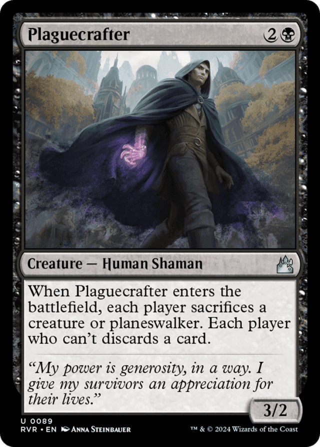As Plaguecrafter's ability resolves, first the player whose turn it is chooses a creature or planeswalker they control, then each other player in turn order does the same, knowing the choices made before them. Then all the chosen permanents are sacrificed at the same time. Next, each player in the same order who couldn't sacrifice a permanent chooses a card in hand without revealing it, then the chosen cards are discarded at the same time. — Each player chooses a permanent to sacrifice from among the creatures and planeswalkers they control. You don't choose which type of permanent any other player has to sacrifice. — Plaguecrafter can be the creature its controller sacrifices for its own ability.