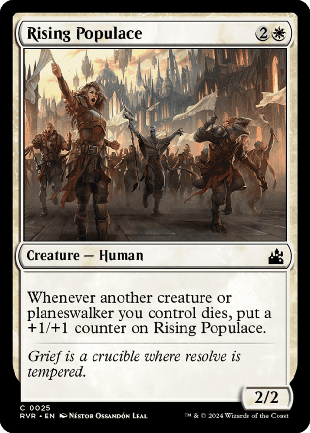 If Rising Populace and another creature you control die simultaneously (perhaps because they were both dealt lethal damage in combat), Rising Populace won’t be on the battlefield as its triggered ability resolves. It can’t be saved by the +1/+1 counter that would have been put on it. — If a planeswalker that’s also a creature dies, Rising Populace’s ability triggers only once.