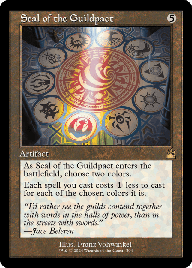 If a spell you cast has {X} in its mana cost, you choose the value of X before calculating the spell's total cost. For example, if that spell's mana cost is {X}{R}{G} and you've chosen red and green, you could choose 5 as the value of X and pay {3}{R}{G} to cast the spell. — If there are additional costs to cast a spell, or if the cost to cast a spell is increased by an effect (such as the one created by Thalia, Guardian of Thraben's ability), apply those increases before applying cost reductions. — Seal of the Guildpact's last ability can't reduce the amount of colored mana you pay for a spell. It reduces only the generic component of that cost. — Seal of the Guildpact's last ability doesn't change the mana cost or mana value of any spell. It changes only the total cost you pay. — The cost reduction can apply to alternative costs such as evoke costs. — You must choose two different colors.