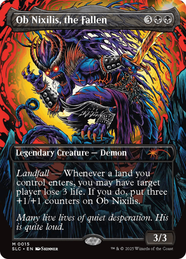 Landfall — Whenever a land you control enters, you may have target player lose 3 life. If you do, put three +1/+1 counters on Ob Nixilis.