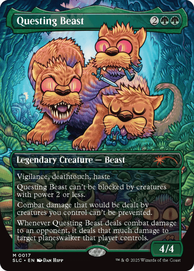 Vigilance, deathtouch, haste Questing Beast can't be blocked by creatures with power 2 or less. Combat damage that would be dealt by creatures you control can't be prevented. Whenever Questing Beast deals combat damage to an opponent, it deals that much damage to target planeswalker that player controls.