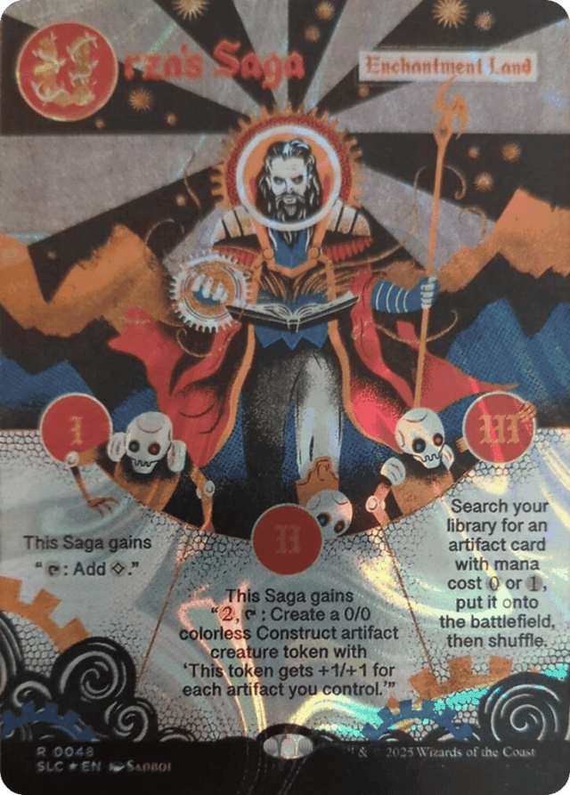 (As this Saga enters and after your draw step, add a lore counter. Sacrifice after III.) I — This Saga gains "{T}: Add {C}." II — This Saga gains "{2}, {T}: Create a 0/0 colorless Construct artifact creature token with 'This token gets +1/+1 for each artifact you control.'" III — Search your library for an artifact card with mana cost {0} or {1}, put it onto the battlefield, then shuffle.
