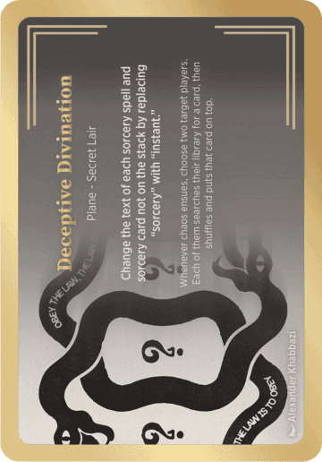 All permanents are artifacts in addition to their other types. All cards that aren't on the battlefield, spells, and permanents are colorless. Players may spend mana as though it were mana of any color. Whenever chaos ensues, the next spell you cast this turn has affinity for artifacts.