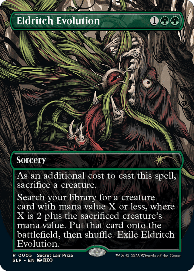 As an additional cost to cast this spell, sacrifice a creature. Search your library for a creature card with mana value X or less, where X is 2 plus the sacrificed creature's mana value. Put that card onto the battlefield, then shuffle. Exile Eldritch Evolution.