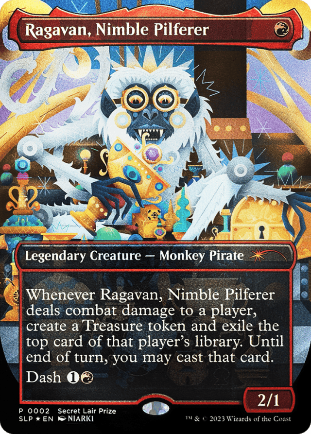 Whenever Ragavan deals combat damage to a player, create a Treasure token and exile the top card of that player's library. Until end of turn, you may cast that card. Dash {1}{R} (You may cast this spell for its dash cost. If you do, it gains haste, and it's returned from the battlefield to its owner's hand at the beginning of the next end step.)