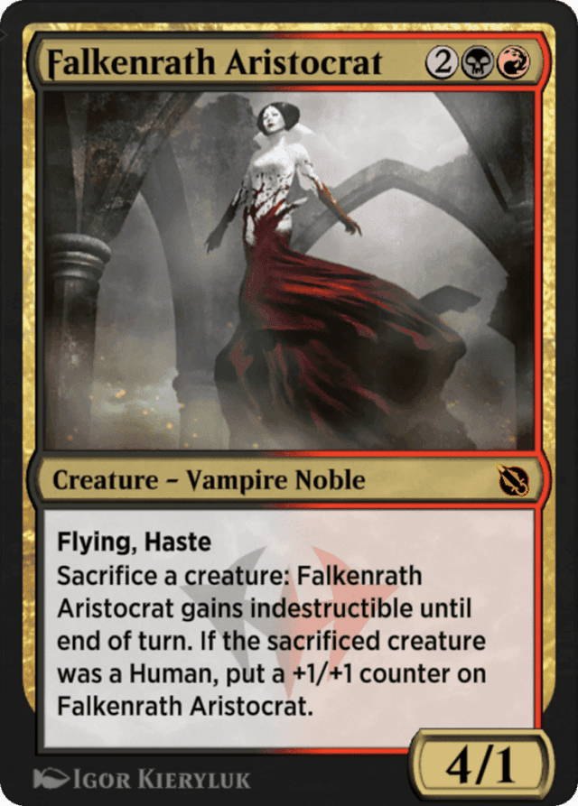 Falkenrath Aristocrat's activated ability checks whether the sacrificed creature was a Human as it last existed on the battlefield. It doesn't matter what its creature types are in the graveyard. — If the sacrificed creature was a Human, Falkenrath Aristocrat gains indestructible and also gets a +1/+1 counter. — You can sacrifice Falkenrath Aristocrat to pay the cost of its own ability. It won't receive a counter or gain indestructible, but it will enable abilities that check when or if a creature dies.