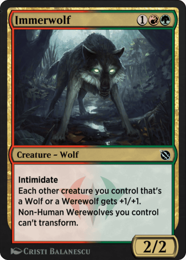 A creature that’s both a Wolf and a Werewolf gets the bonus only once. — A “non-Human Werewolf” is a creature that is a Werewolf but is not a Human. — Immerwolf’s bonus never applies to itself, even if it somehow becomes a Werewolf creature.