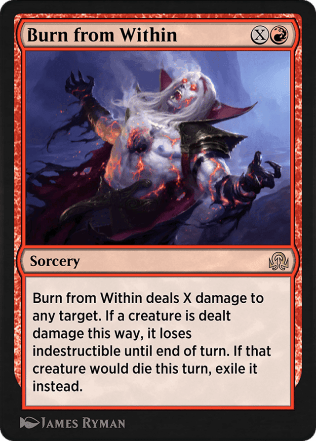 Burn from Within deals X damage to any target. If a creature is dealt damage this way, it loses indestructible until end of turn. If that creature would die this turn, exile it instead.