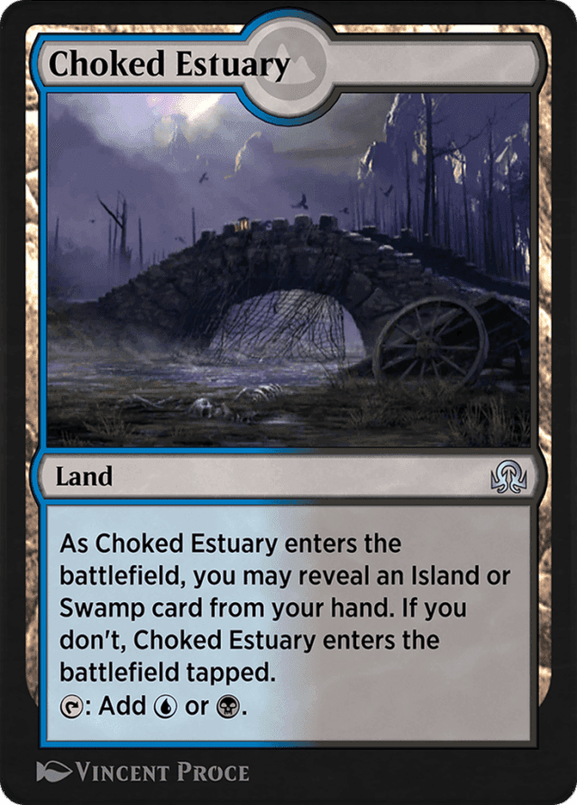 If an Island or Swamp is entering the battlefield from your hand at the same time as Choked Estuary, you may reveal the other land to have Choked Estuary enter untapped. — If an effect instructs you to put Choked Estuary onto the battlefield tapped, it will still enter the battlefield tapped even if you reveal a land card from your hand. — Lands don't have a subtype just because they can produce mana of the corresponding color. Choked Estuary itself is neither an Island nor a Swamp, even though it produces blue and black mana, so you can't reveal one to satisfy the ability of another. — You may reveal any land card with either or both of the appropriate subtypes. It doesn't have to be a basic land. For example, you could reveal Prairie Stream from the Battle for Zendikar set to satisfy the ability of Choked Estuary.