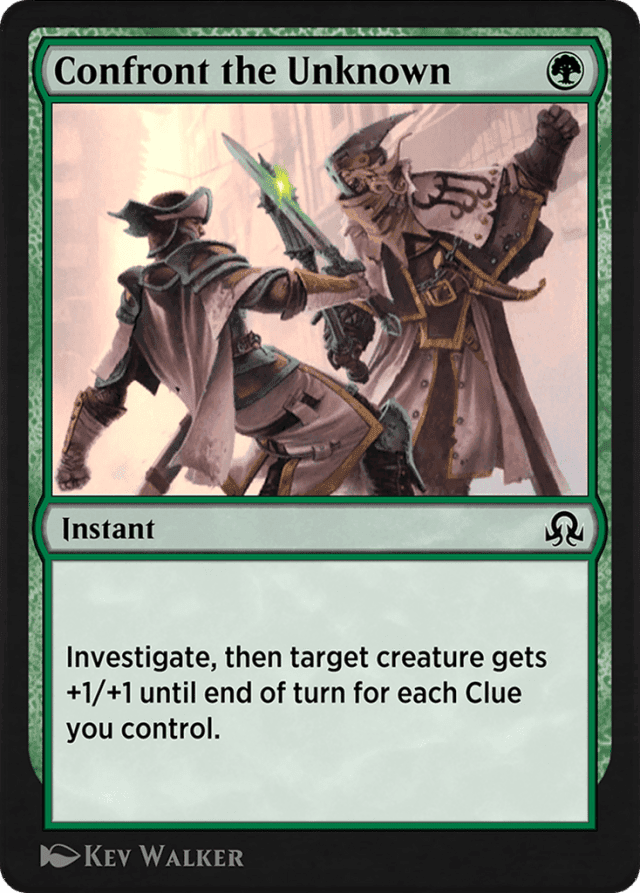 Clue is an artifact type. Even though it appears on some cards with other permanent types, it's never a creature type, a land type, or anything but an artifact type. — If an effect refers to a Clue, it means any Clue artifact, not just a Clue artifact token. For example, you can sacrifice Wrench to pay for Alquist Proft, Master Sleuth's activated ability. — No player may take any action in between the two steps of Confront the Unknown, so the target creature will get at least +1/+1. — You can't cast a spell without choosing legal targets. If all of those targets become illegal, the spell doesn't resolve and you won't investigate. — You can't sacrifice a Clue to pay multiple costs. For example, you can't sacrifice a Clue token to activate its own ability and also to activate Alquist Proft, Master Sleuth's ability.