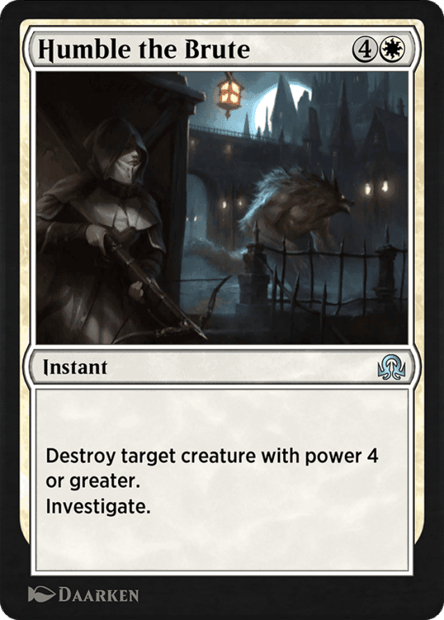 Destroy target creature with power 4 or greater. Investigate.(Create a Clue token. It's an artifact with "{2}, Sacrifice this token: Draw a card.")