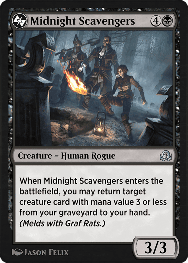 When this creature enters, you may return target creature card with mana value 3 or less from your graveyard to your hand. (Melds with Graf Rats.)