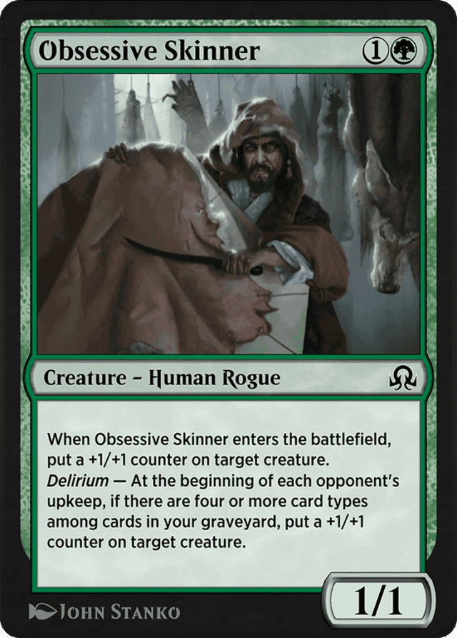 Because you consider only the characteristics of a double-faced card's front face while it's not on the battlefield, the types of its back face won't be counted for delirium. — Both of Obsessive Skinner's abilities can target Obsessive Skinner itself. — In some rare cases, you can have a token or a copy of a spell in your graveyard at the moment that an object's delirium ability counts the card types among cards in your graveyard, before that token or copy ceases to exist. Because tokens and copies of spells are not cards, even if they are copies of cards, their types will never be counted. — Most triggered delirium abilities use an intervening "if" clause. There must be four or more card types among cards in your graveyard in order for these abilities to trigger, otherwise they never trigger at all. There's no way to have the ability trigger if there aren't enough card types, even if you intend to raise that number in response to the triggered ability. The number of card types is checked again as the trigger resolves, and if it has become too low somehow, the ability does nothing. If which card types are in your graveyard changes but the quantity of card types stays the same (or increases), then the delirium triggered ability will still resolve. — The card types in Magic are artifact, battle, creature, enchantment, instant, kindred, land, planeswalker, and sorcery. Supertypes (such as legendary and basic) and subtypes (such as Human and Equipment) are not counted. — The number of card types matters, not the number of cards. For example, Wicker Witch (an artifact creature) along with Catalog (an instant) and Chaplain's Blessing (a sorcery) will enable delirium.