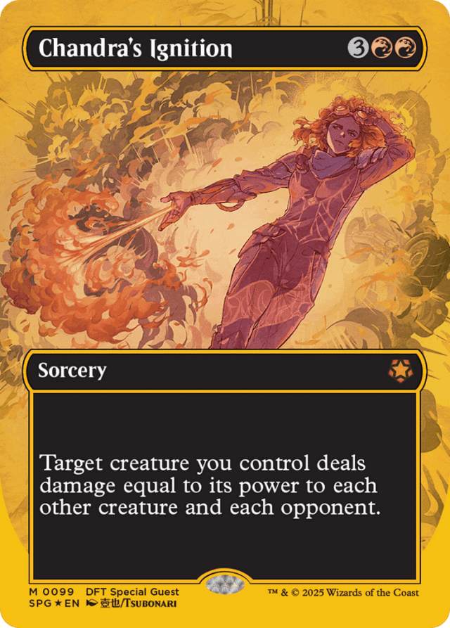If the creature becomes an illegal target by the time Chandra's Ignition tries to resolve (perhaps because another player controls it or it's left the battlefield), Chandra's Ignition won't resolve and none of its effects will happen. No damage will be dealt. — The creature is the source of the damage, not Chandra's Ignition. For example, Chandra's Ignition can have a white creature deal damage to a creature with protection from red. — Use the power of the target creature as Chandra's Ignition resolves to determine how much damage it deals to each other creature and each opponent.