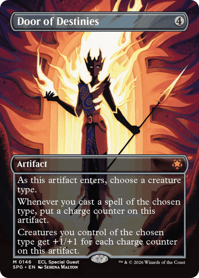 If you cast a creature spell of the chosen type, Door of Destinies will get a charge counter before the creature enters. The creature will enter with the additional boost to its power and toughness. — Creature types, such as Human or Sliver, appear after the dash on the type line of creatures. Notably, artifact is not a creature type. A creature may have more than one creature type, such as Goblin Warrior. Such a creature would benefit from Door of Destinies if the chosen creature type was Goblin or Warrior.