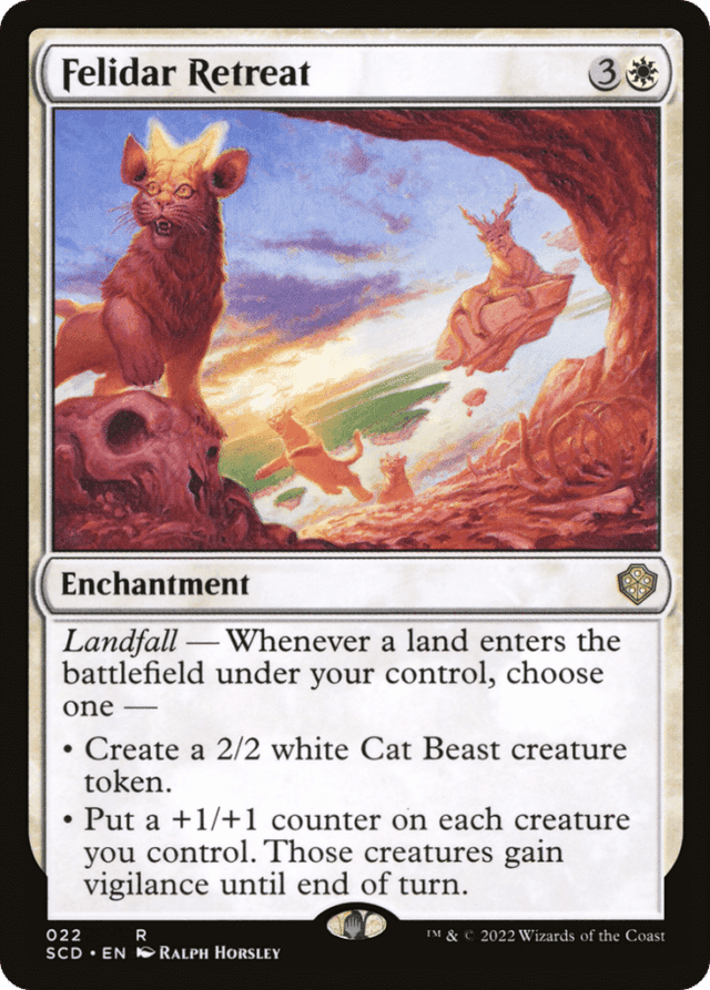 Landfall — Whenever a land you control enters, choose one — • Create a 2/2 white Cat Beast creature token. • Put a +1/+1 counter on each creature you control. Those creatures gain vigilance until end of turn.