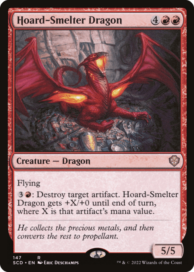 If the mana cost of a permanent includes {X}, that X is considered to be 0. — If the targeted artifact is an illegal target by the time the activated ability resolves, the ability doesn't resolve. Hoard-Smelter Dragon won't get the bonus. — If the activated ability resolves but the targeted artifact isn't destroyed (perhaps because it has indestructible or it regenerates), Hoard-Smelter Dragon will still get the bonus.