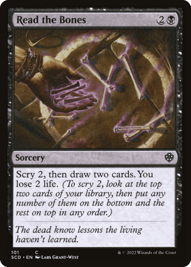 Scry appears on some spells and abilities with one or more targets. If all of the spell or ability's targets are illegal when it tries to resolve, it won't resolve and none of its effects will happen. You won't scry. — The loss of life is part of the spell's effect. It's not an additional cost. If Read the Bones doesn't resolve, you won't lose life. — When you scry, you may put all the cards you look at back on top of your library, you may put all of those cards on the bottom of your library, or you may put some of those cards on top and the rest of them on the bottom. — You choose how to order cards returned to your library after scrying no matter where you put them. — You perform the actions stated on a card in sequence. For some spells and abilities, that means you'll scry last. For others, that means you'll scry and then perform other actions.
